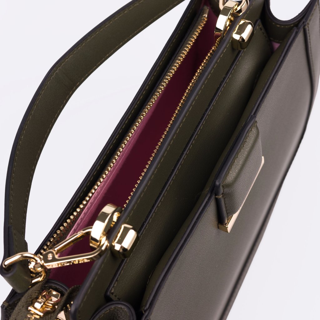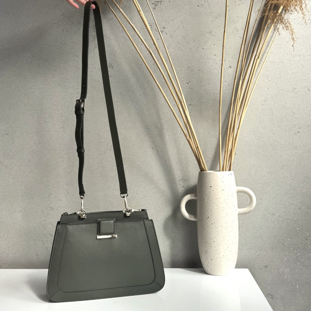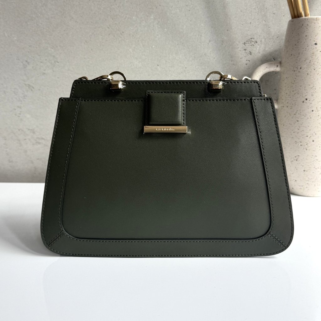 Kožená kabelka v olivovo zelenej farbe. Čisté línie a nádherný elegantný tvar dodávajú kabelke luxus. Súčasťou kabelky sú dve remienka. Jedno do ruky a druhé na nosenie na ramene. Kovové doplnky sú v svetlozlatej farbe.