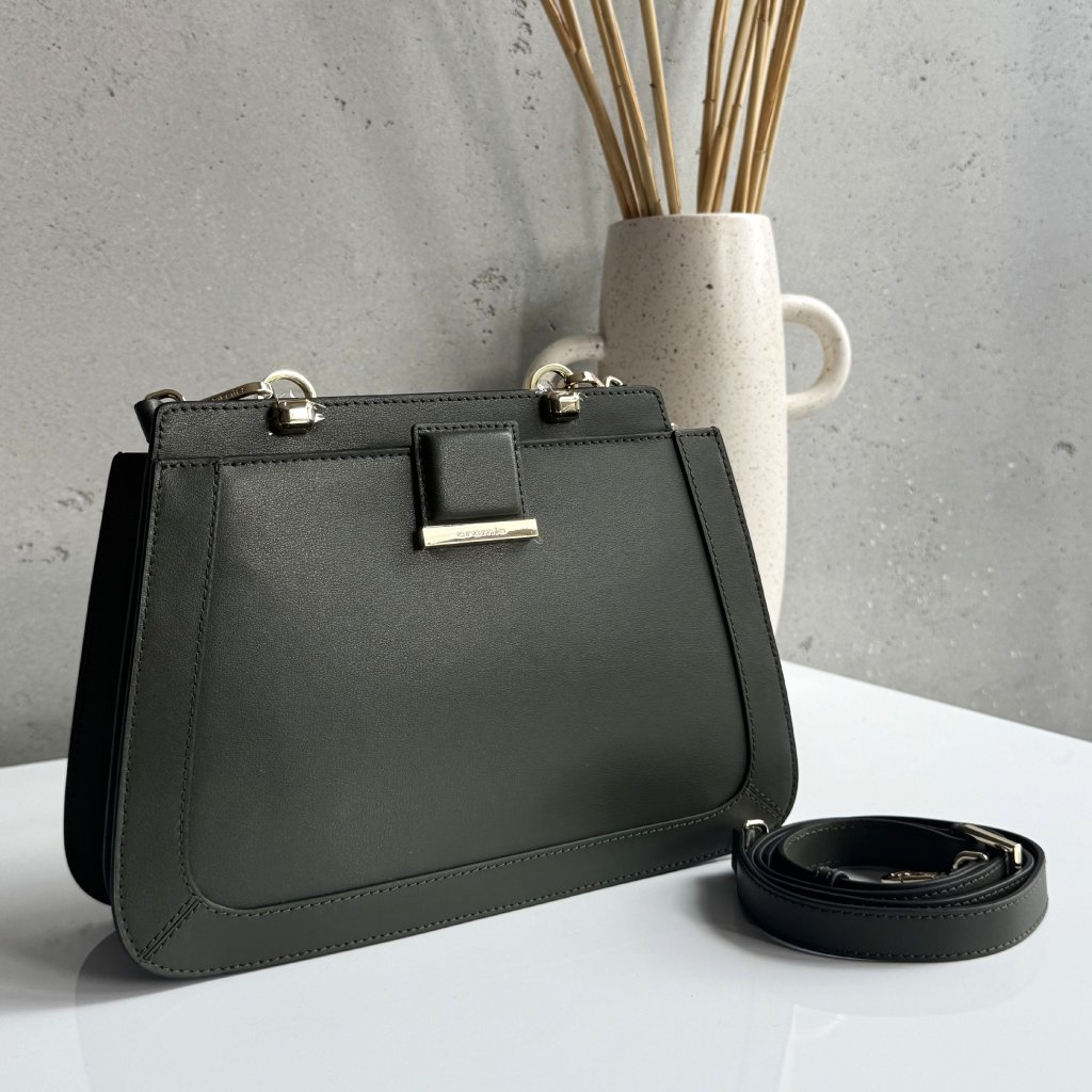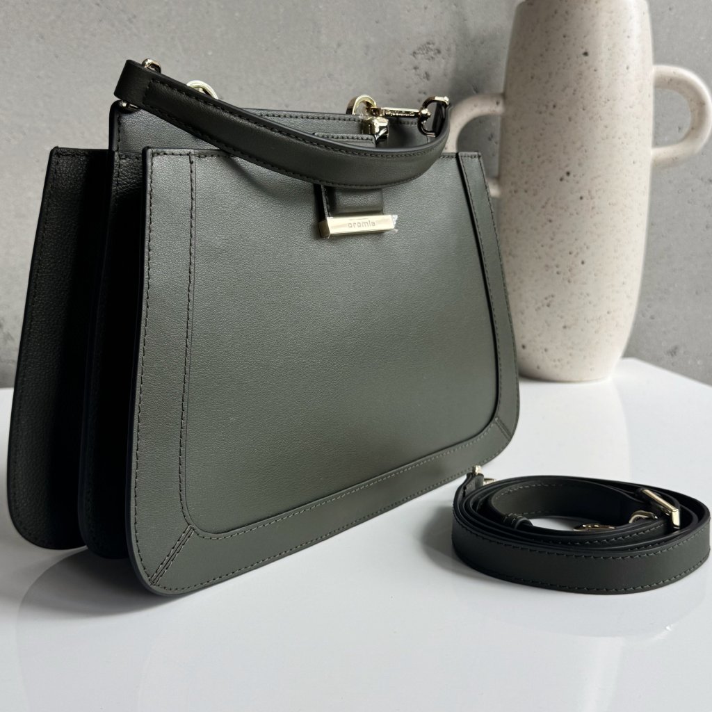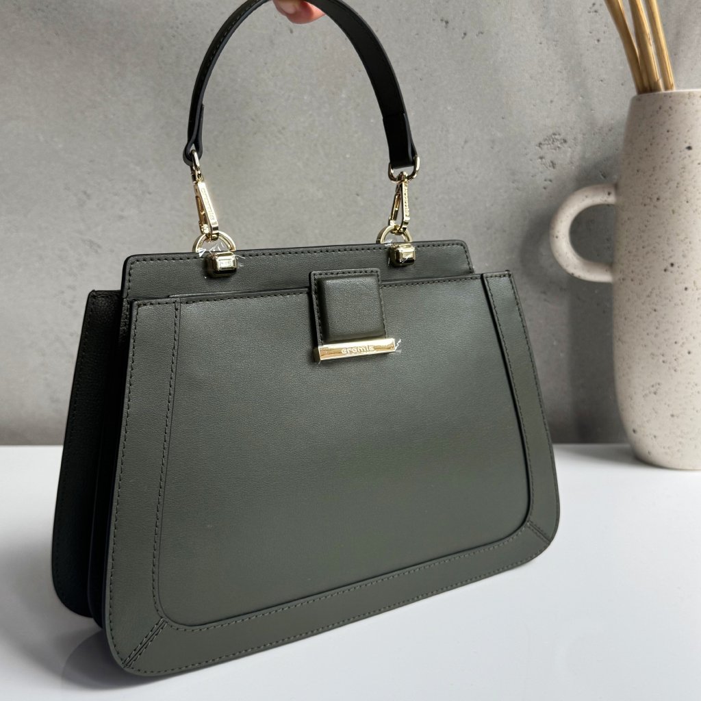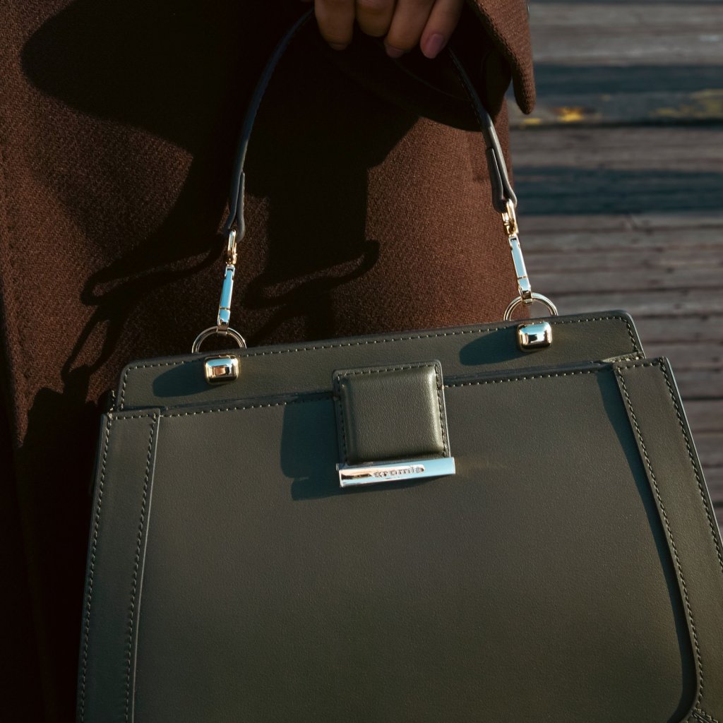 Kožená kabelka v olivovo zelenej farbe. Čisté línie a nádherný elegantný tvar dodávajú kabelke luxus. Súčasťou kabelky sú dve remienka. Jedno do ruky a druhé na nosenie na ramene. Kovové doplnky sú v svetlozlatej farbe.