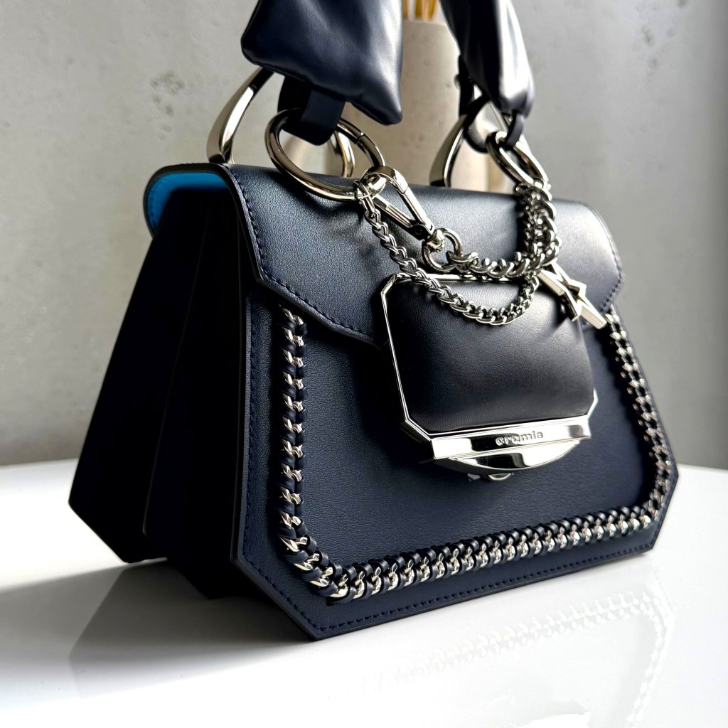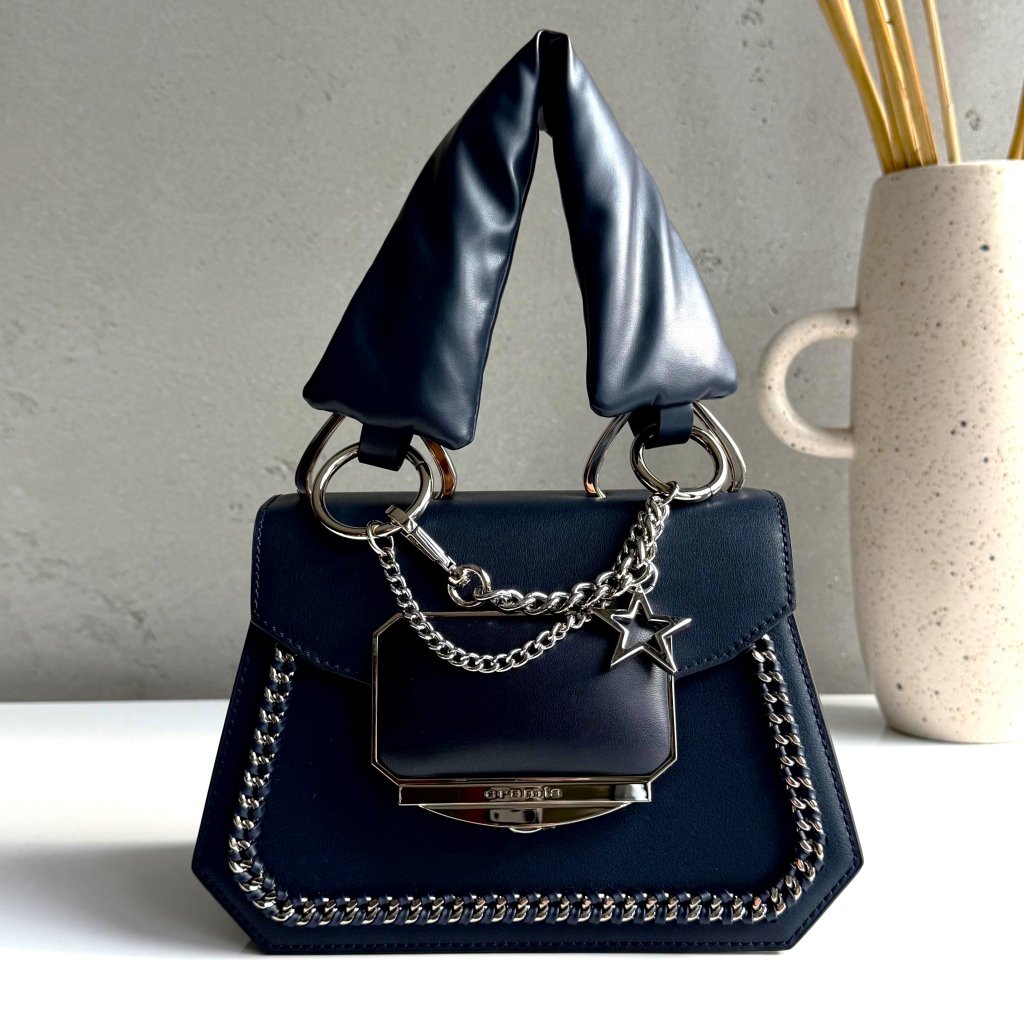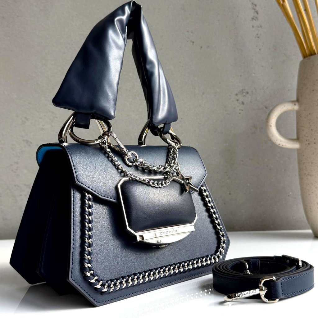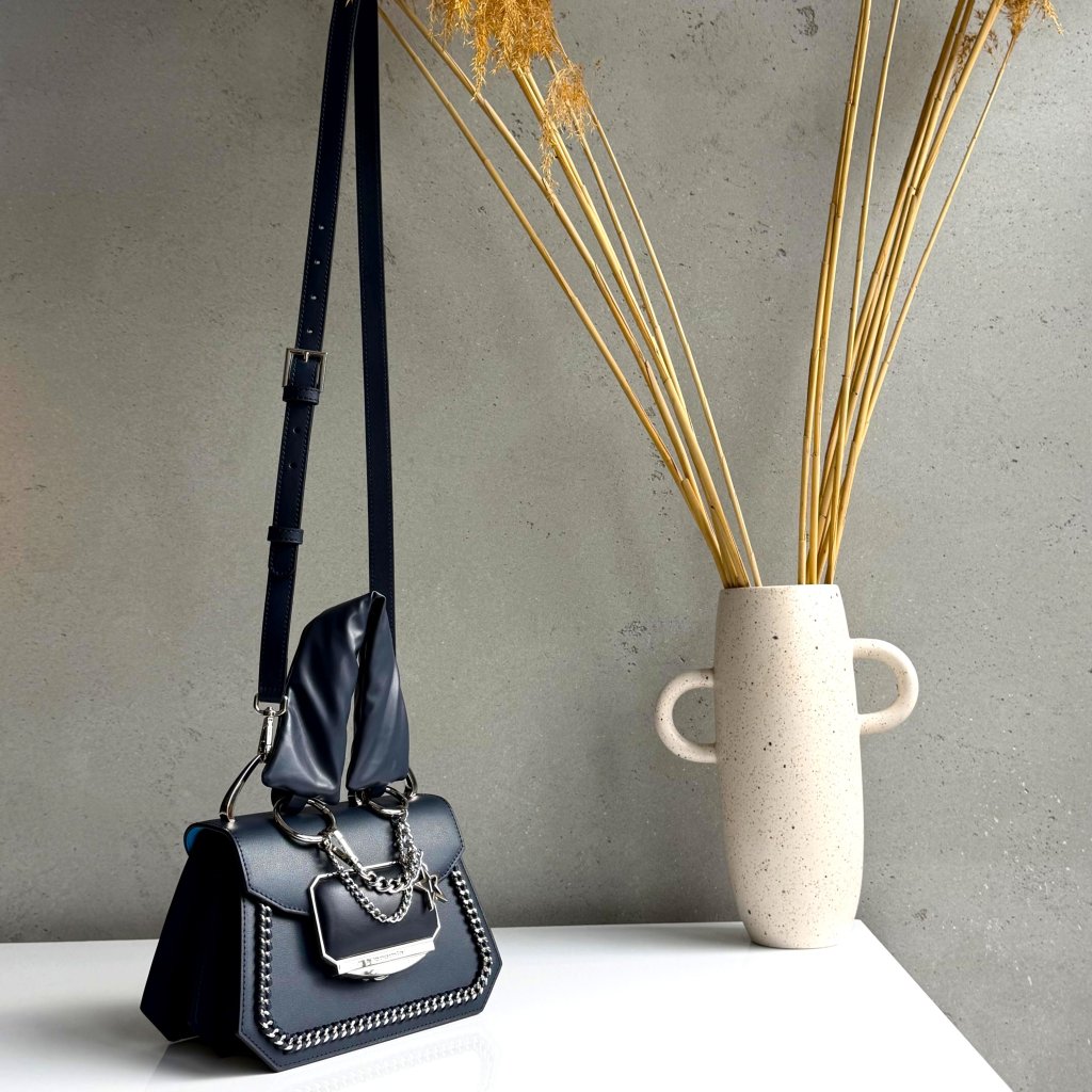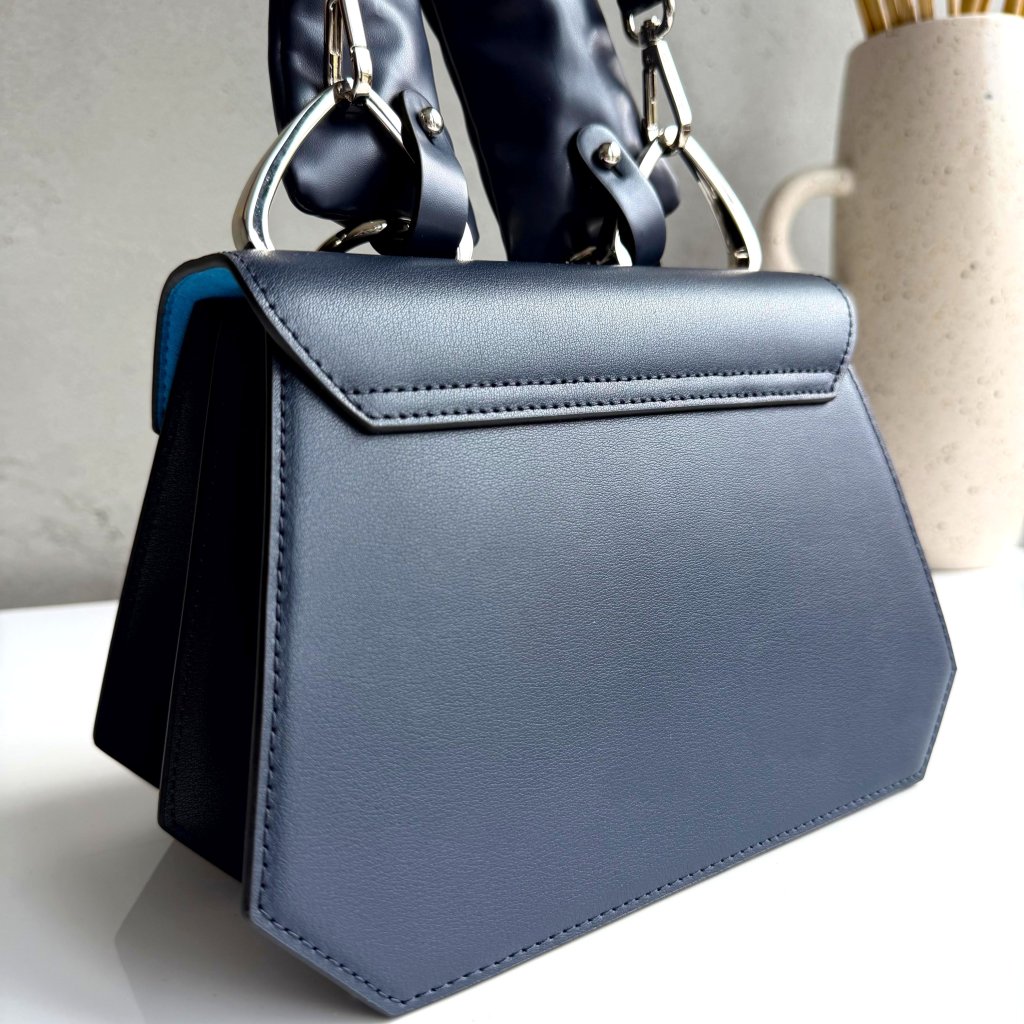 Netypický tvar kabelky zabezpečí štýl a jedinečnosť tvojho outfitu. Môžeš nosiť v ruke alebo crossbody, obe je odnímateľné, čiže kabelka sa prispôsobí tvojej nálade. Vnútorná modrá farba zabezpečí svieži a luxusný vzhľad aj zvnútra nie len zvonku. Súčasťou kabelky je aj odnímateľná kovová strieborná retiazka s malým príveskom - hviezdička. Vďaka tmavomodrej farbe je ľahko kombinovateľná a bude sa ti hodiť ako k ležérnemu outfitu tak aj elegantnému kostýmu.
