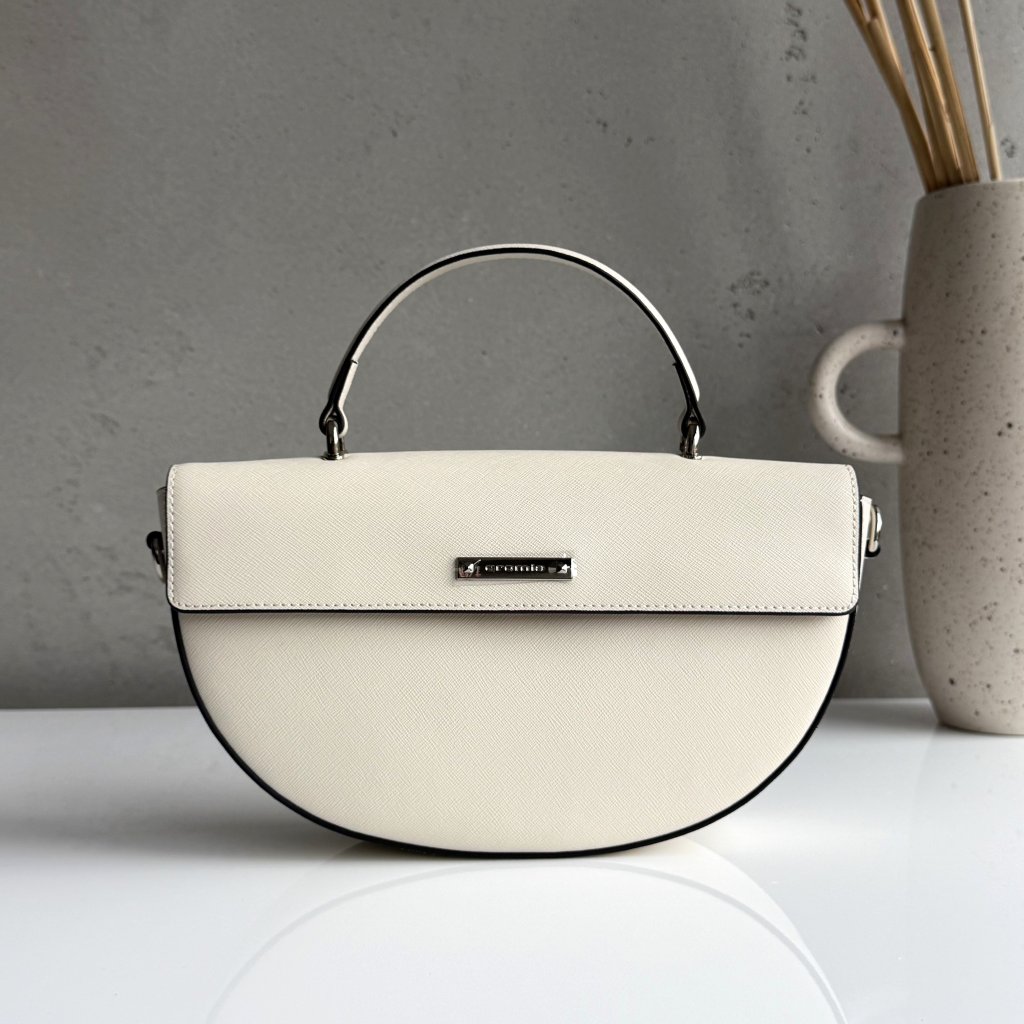Zaujímavá kabelka v neštandardnom tvare polmesiaca vyrobená z teľacej kože. Môžeš ju nosiť cez rameno, crossbody alebo v ruke. Obohatená o kovový štítok s logom CROMIA. Táto inovatívna kabelka má zaoblený tvar a minimalistický dizajn.
