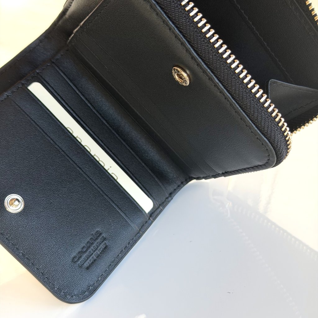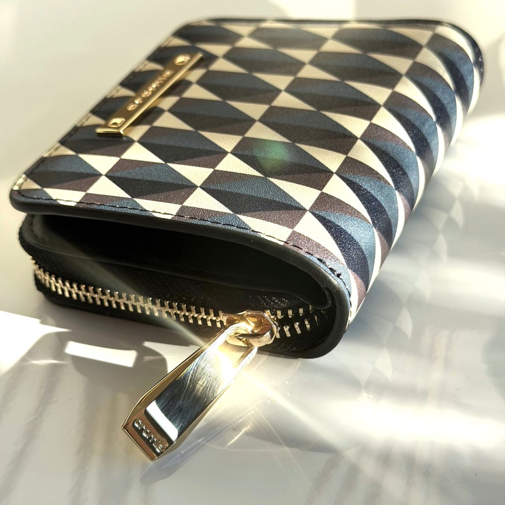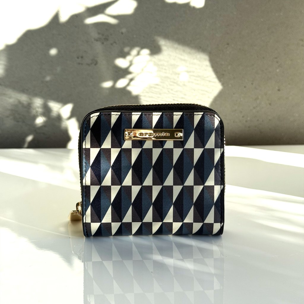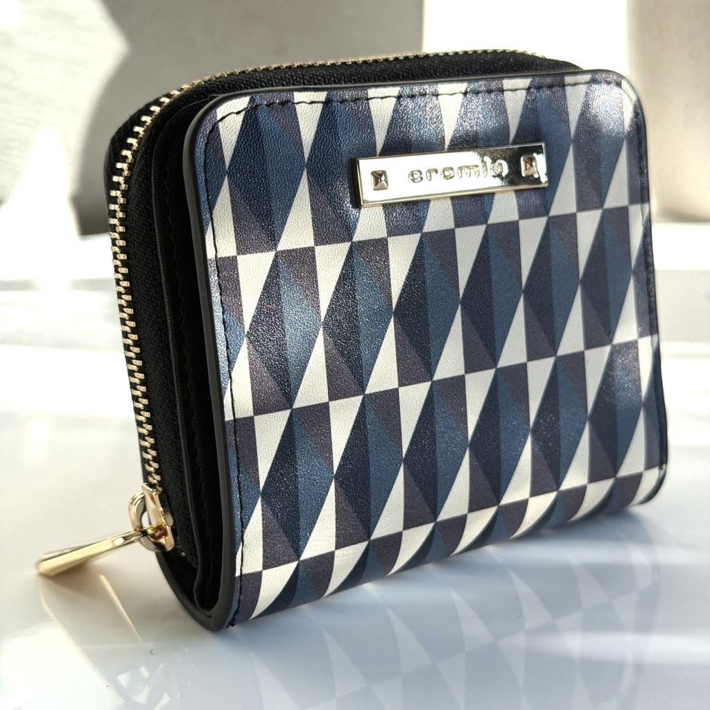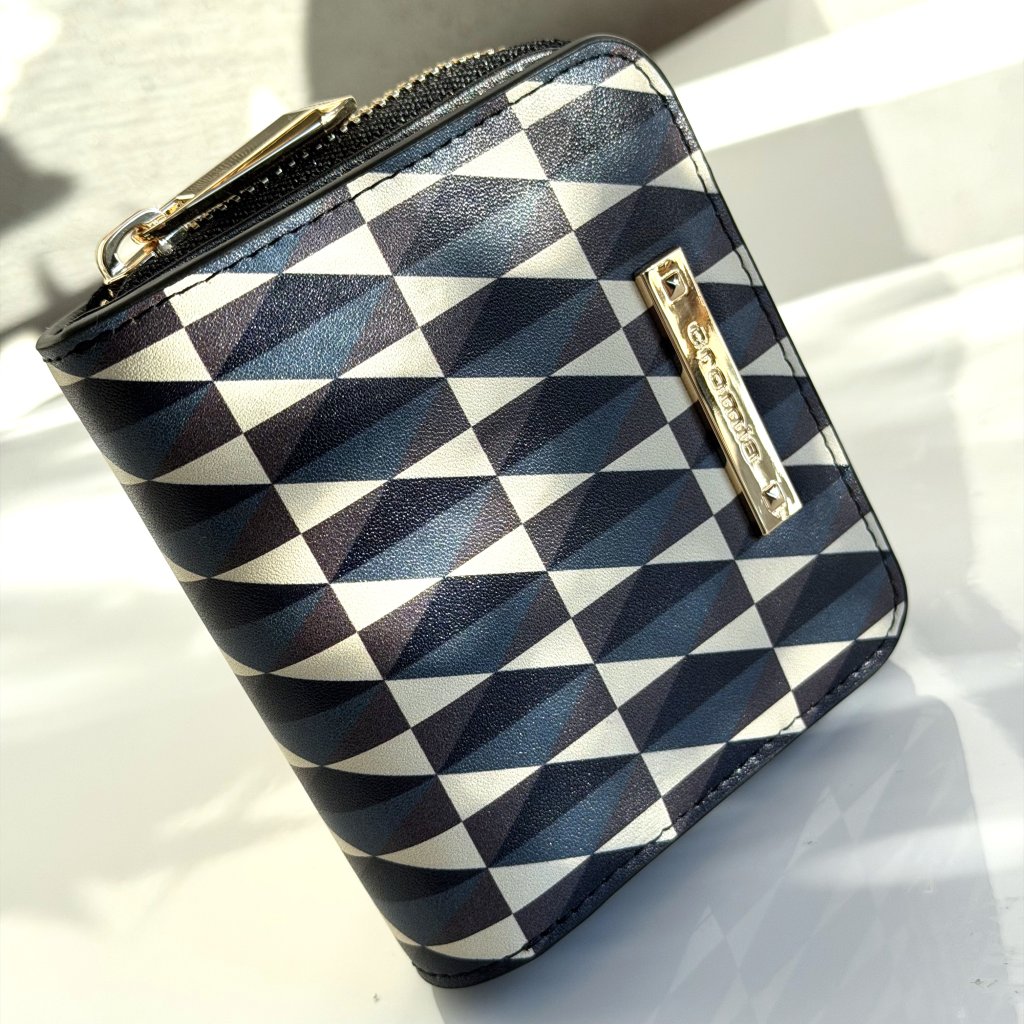 Geometrický vzor na peňaženke pôsobí luxusne a nadčasovo. Peňaženka má vo vnútornej časti 8 priehradiek na kreditné karty a jednu na bankovky.